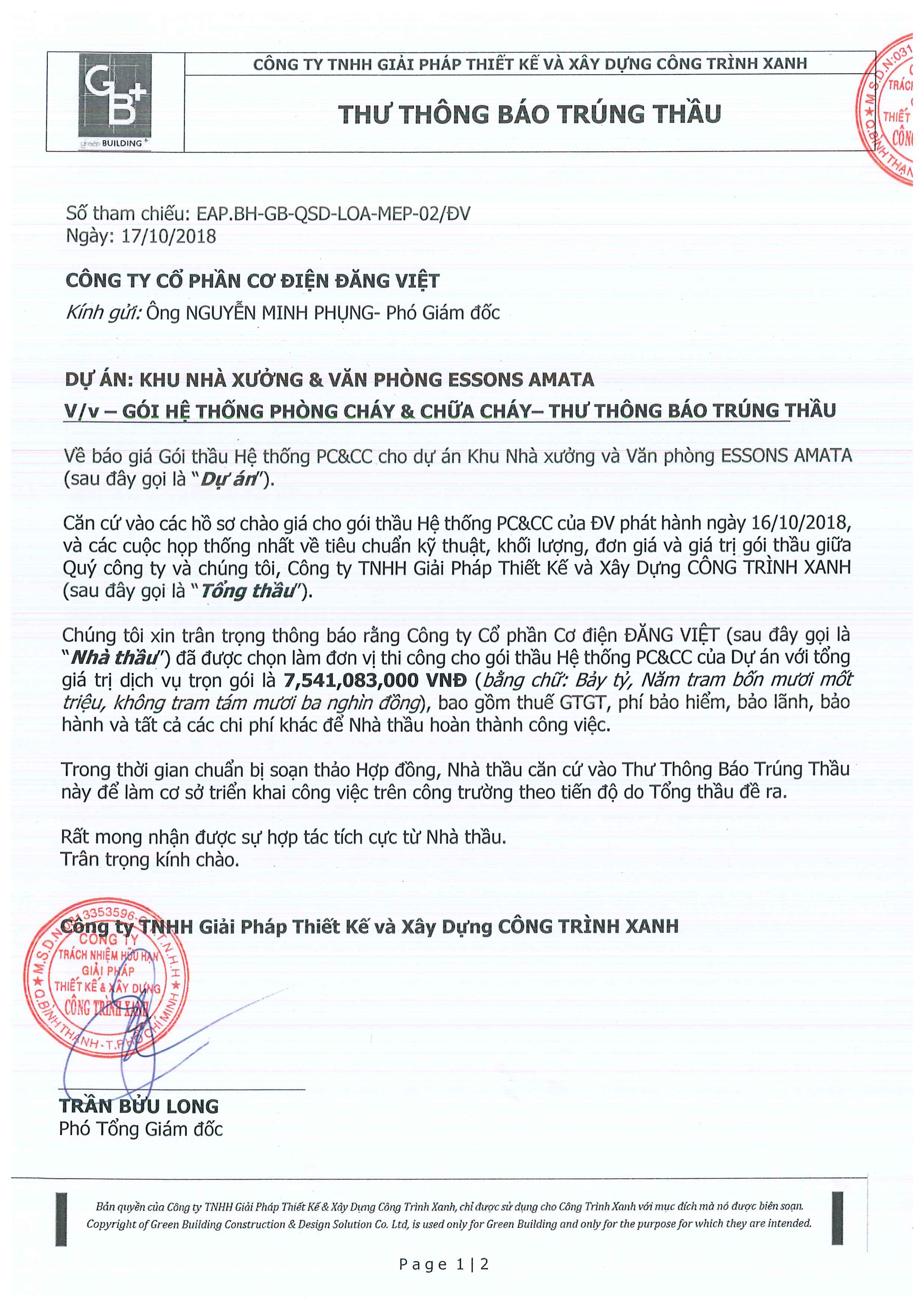 Ngày 08/11/2013, Trung tâm chứng nhận phù hợp QUACERT ra quyết định số: 12418/QUACERT-KT về việc tiếp tục duy trì chứng nhận cho Công ty Cổ Phần Cơ Điện Đăng Việt.