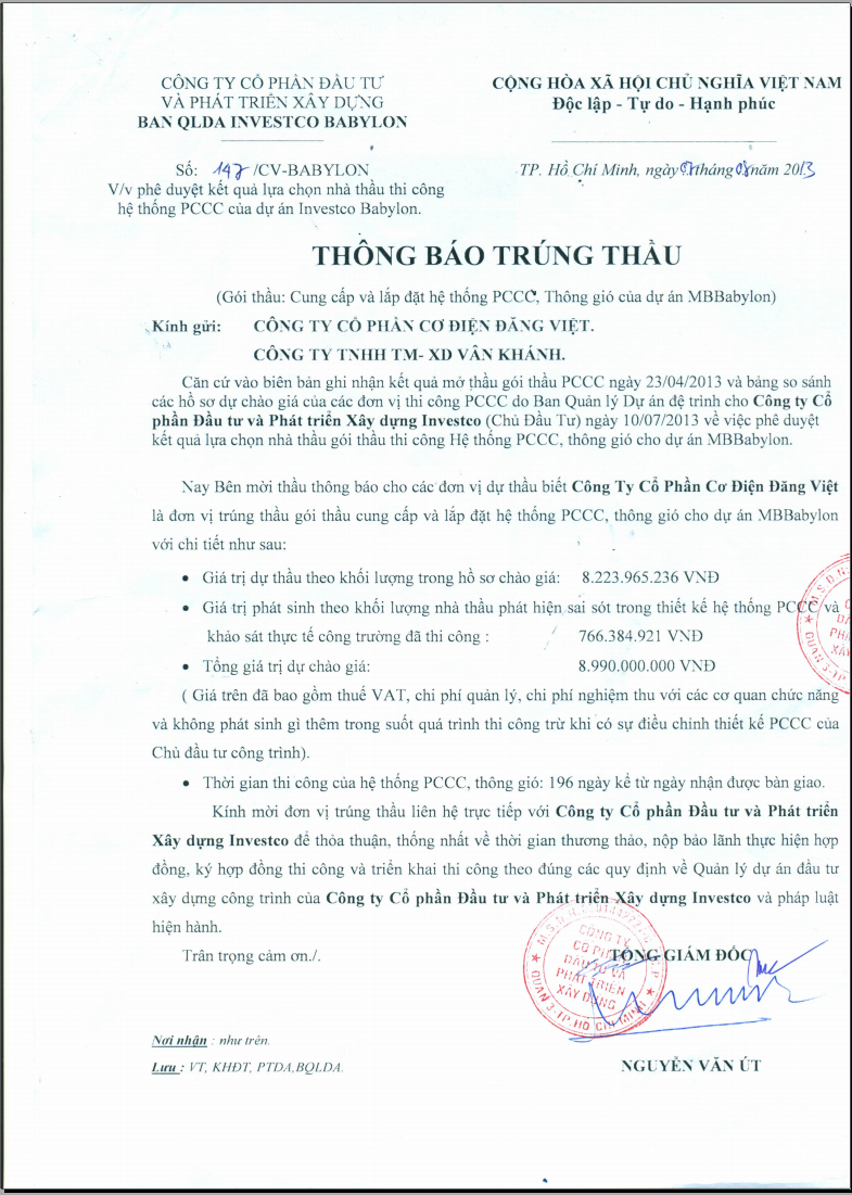 Theo công văn số 147/CV- BABYLON ngày 7/8/2013 từ Công ty Cổ phần Đầu tư và Phát triển Xây Dựng InvestcoCông ty Cổ phần Cơ điện Đăng Việt đã chính thức là đơn vị trúng thầu gói thầu cung cấp và lắp đặt hệ thống PCCC, thông gió cho dự án MBBabylon.
